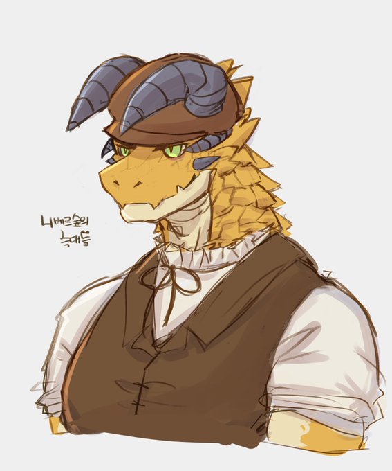 【아무 그림이라도 그려올리기 챌린지 8일차】 용 수인 처음 그려봅니다.. . . . . . 다음엔 더 잘그려야지!!!! '니베르 숲의 늑대들'에서 제니스를 찾아왔던 용인입니다. 이런 뿔을달고 모자를쓰다니... 데버스티아의 용인들은 예사롭지않군요.