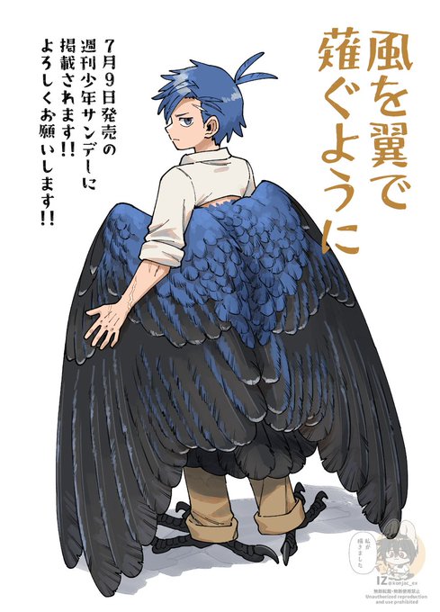 本日発売の週刊少年サンデーにて、新作読切「風を翼で薙ぐように」が掲載されています!! 飛べなくなった鳥人が再び飛ぶために頑張る話です! よろしくお願いします!!