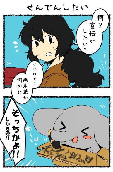 動物と聞くとこの子かなーダンボールに入ったゾウの男の子だんぞうくん。お友達が沢山いてアパートでお姉さんと一緒に生活してます。探すと別名義ですがどこかに漫画があるかも・・! #よその子企画6日目