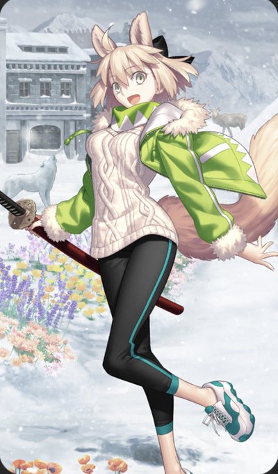 ・ケモ耳、尻尾 ・Quickカラーのジャケット ・Quickカラーのネックウォーマー ・ニット ・浅葱色のスニーカー ジャケットとかスニーカーとか商品化してくれ、あとフィギュア化もお願いします 本当、社長愛してるぞ #FGO #沖田さん