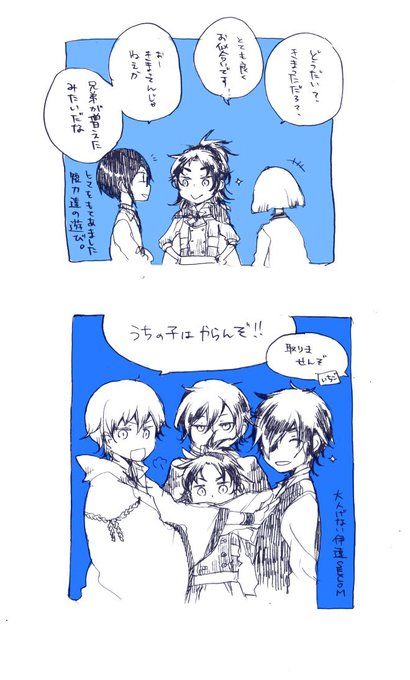 似合うかなあと思って軽率な衣装チェンジ。 粟田口衣装貞ちゃんと大人気ない伊達セコム。伽羅坊は付き合わされてる。 マントは前田から。他は薬研からの借り物。