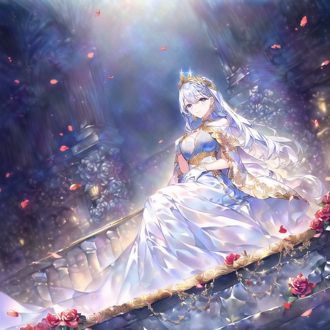 亡国の廃墟とエルフのお姫さま バラはどう使っても格好いいモチーフ 古代遺跡との相性も素敵ですね {stone-staircase}石階段 #AIart #AIイラスト #NovelAI
