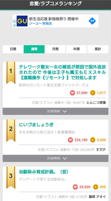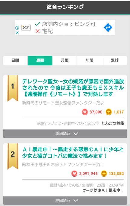 『ノベルアップ+』総合&恋愛W週間1位㊗️💕