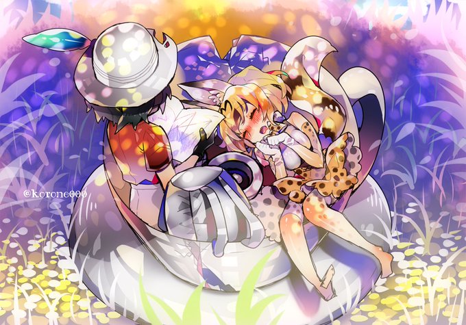「狭い所は落ち着くなぁ…」 「んみゃあ~~♡おひるね、きもちいいね~♡」 #けものフレンズ