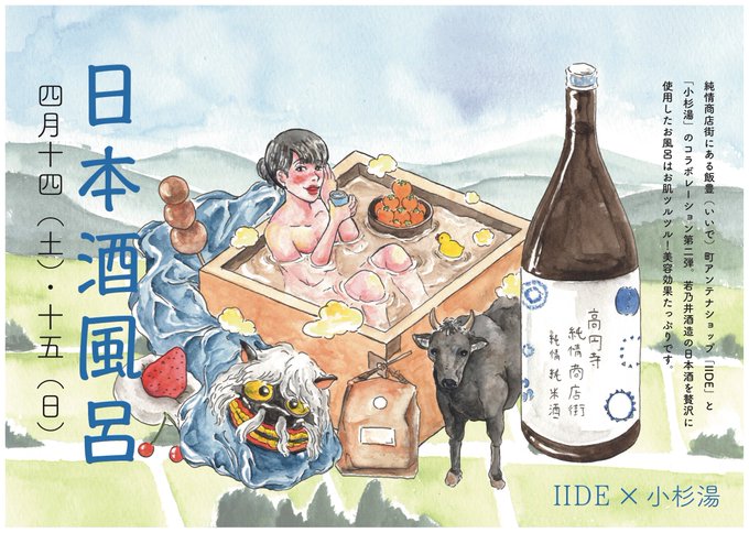 4月14日(土)15日(日)は高円寺にある山形県飯豊町アンテナショップ「IIDE」とのコラボレーション第2弾。地元の若乃井酒造さんによる日本酒を贅沢に使用したお風呂です。