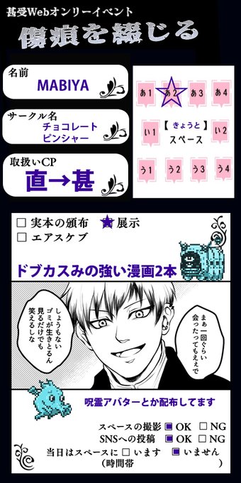 既刊3種・展示16作・無配アバター6種のみあります。31日限定で重暗い傑のSSを再公開しています。