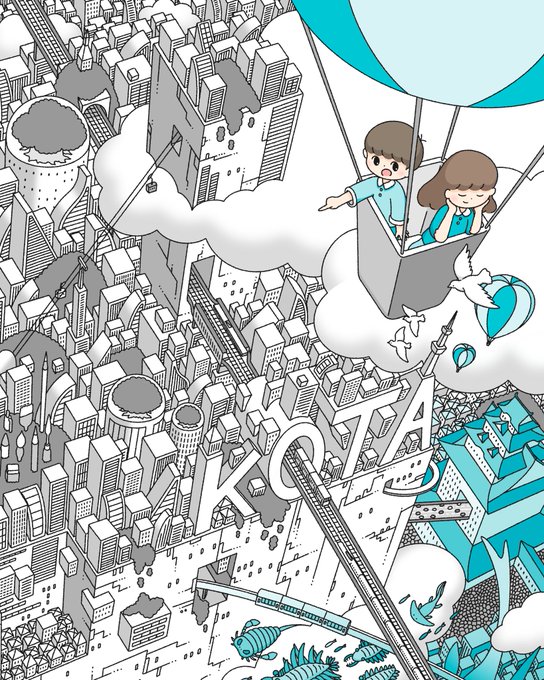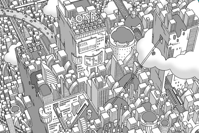 『こた展』のメインビジュアルに描かれている街は『コタシティ』です👀 コタシティは雲の上まで街が続いていて、様々な交通機関が乗り入れています。 https://t.co/CejnjcsAcp