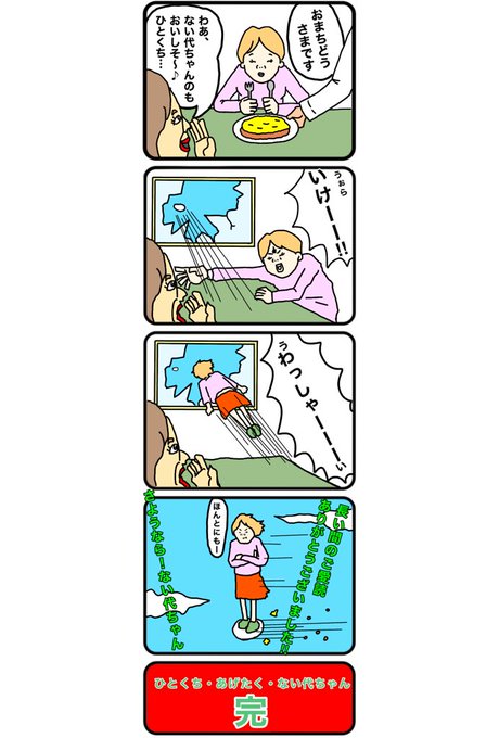 7月14日(水) おはようございます お茶の間大人気アニメ(日曜14:00~) 『ひとくち・あげたく・ない代ちゃん』 記録的低視聴率により本日最終回。 負けないで!ない代ちゃん(と、作者)! #いち日いち4コマ #4コマ #4コマ漫画 #4コママンガ版