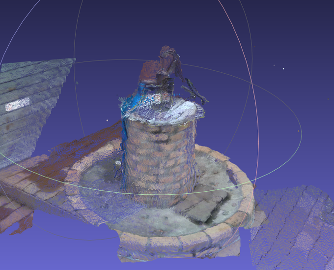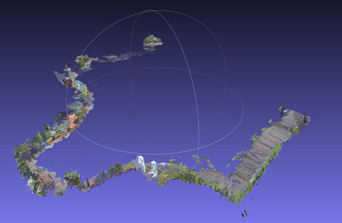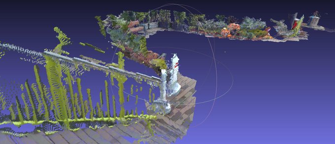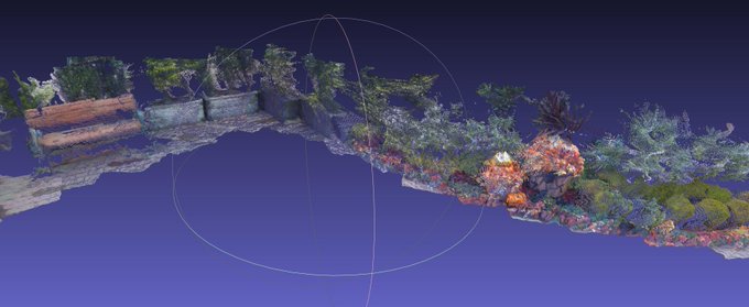 昨日3Dスキャンした某デパートの屋上データ確認中。 意外と植物が綺麗に撮れてた。 雨振らなきゃ全域撮れたのに。 ロケハンとかに使えるかも。写真じゃなく立体モデルで視点も自由に動かせるし。