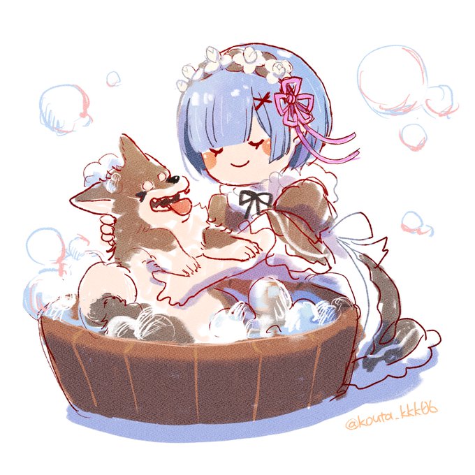 柴犬スバルを洗うレム描いた