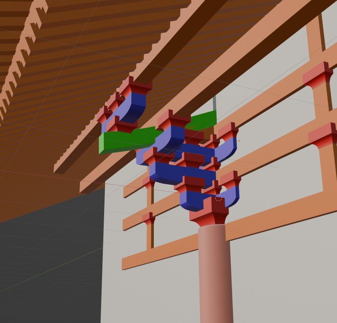 緑の突き出した部材を尾垂木と言って、中国で考案された「昻」が原型。尾垂木は斗栱と組み合わせる事で軒をより外へ伸ばし、伸びた軒の荷重を屋根の重さを利用して上に持ち上げる役割がある。後の時代になると尾垂木は桔木へと進化して屋根の中に取り込まれる。