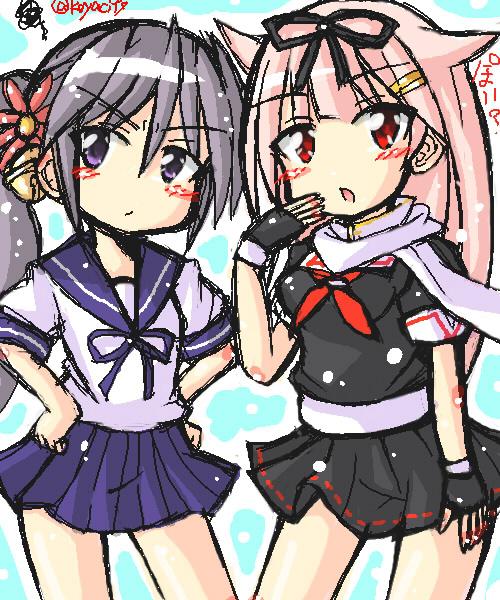 #艦これ版深夜の真剣お絵描き60分一本勝負 ヴェールヌイとナガツキー(ビス子さんは時間でかけなかった)。響に無理矢理帽子と赤リボンつけられた長月。ビスマルクも資材不足で建造挑戦できない子の一人。