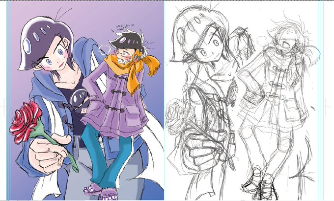 メルティーキッスコーデのダッフルコートかわいい ぎし松さん3、4話のラフなくしたり(どっかいったまま) 1話のカラーデータ失くしたり(みつかった) とてもたのしいです⊂⌒~⊃。Д。)⊃