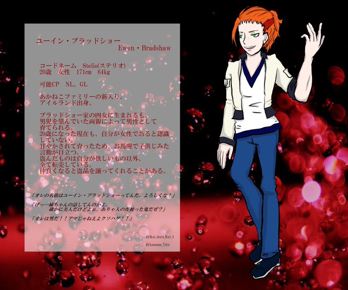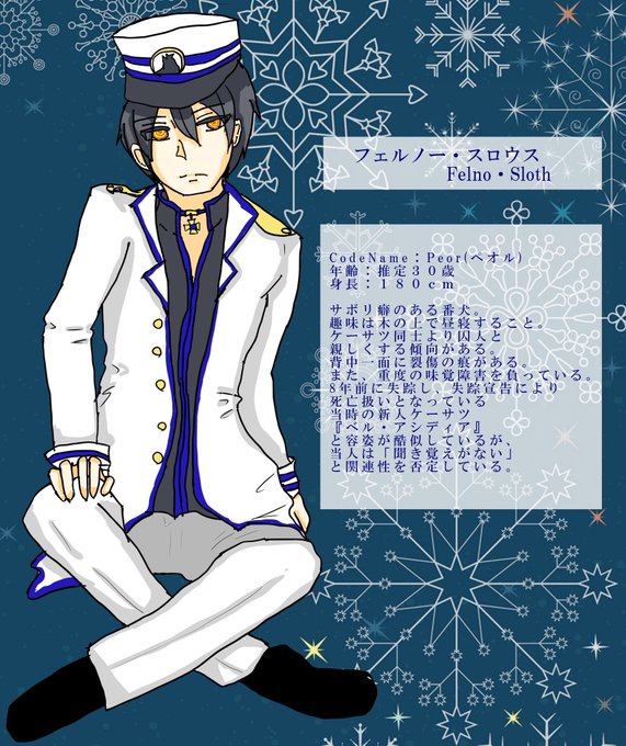 フェルノー 1→2月23日(今考えた) 2→時々すごくガキっぽいところ。 3→元になったキャラに合わせて気怠げな感じになるように、とは思ってました。 4→白銀 杏(しろがね あんず)、木染が初めて作った話の主人公。
