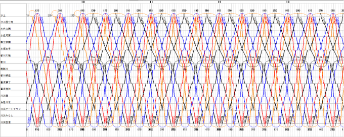 基本の20分サイクルのパターンはできたので、これから列番を振っていく感じです。ここにラッシュ時や、休日デイタイム限定の列車を入れていく形になります。この普通3運用、準急3運用、急行2運用は平日、土休日問わず終日運用に入ります。#架空鉄道