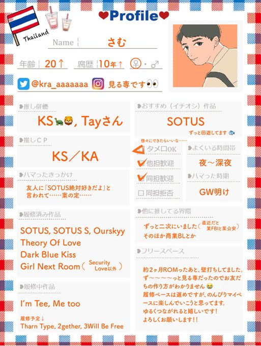 テンプレお借りしました🙏 ずっとSOTUSマラソンをしてますが、徐々に履修済み作品を増やせたらいいな……😇 ときどきお絵描きします〜。 色々お話できると嬉しいです!ぜひ仲良くしてください🙇♀️ #タイBL自己紹介シート #タイBL好きな人と繋がりたい #タイBL好きさんと繋がりたい