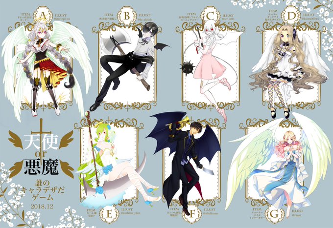 まめぞうさん(@gurinpi_su )主催の、 #誰のキャラデザだゲーム に参加させていただきました~(*´▽`*) テーマは天使と悪魔!私はDの可愛い幼女天使さんを描かせていただきました♪とっても楽しかったです!!私のデザインがどれかは、下記にツリーでアンケートつけますので、当ててみてくださいな!