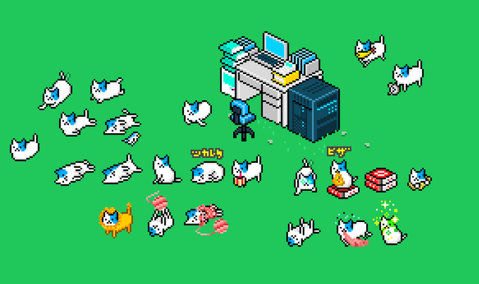 気分転換にドット絵こねこ。ピザのやつとか、つかれたやつとか