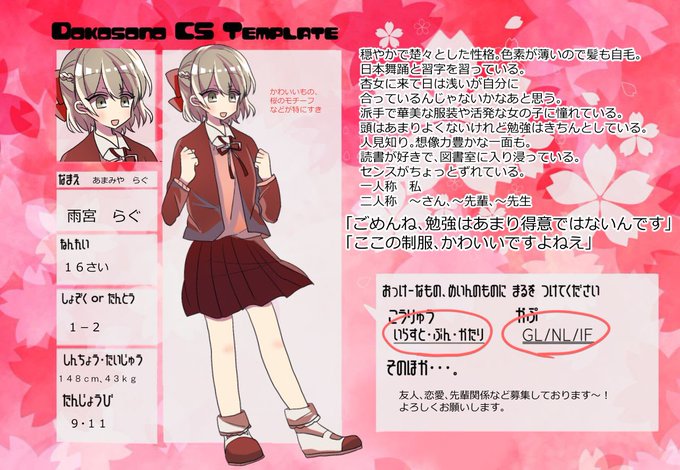 アカウント移動のためキャラシ再投稿すみません…!素敵な企画様(@Dokosono_ )に参加させていただきます、一年生の雨宮です、よろしくおねがいします…! #ドコソノ #ドコソノ_CS