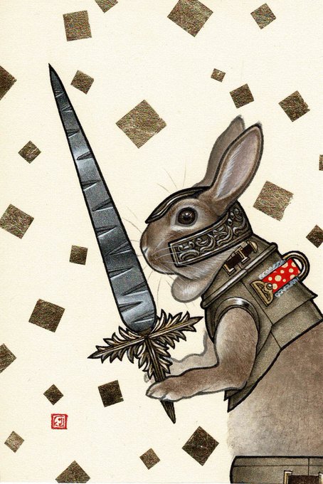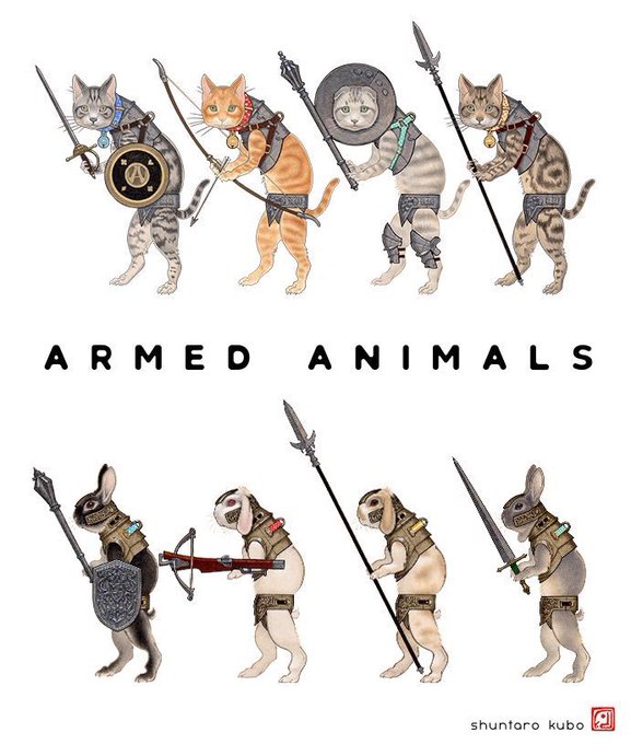 武器や鎧で武装させたペットや家畜「武装せる動物」シリーズの作品を描いています。