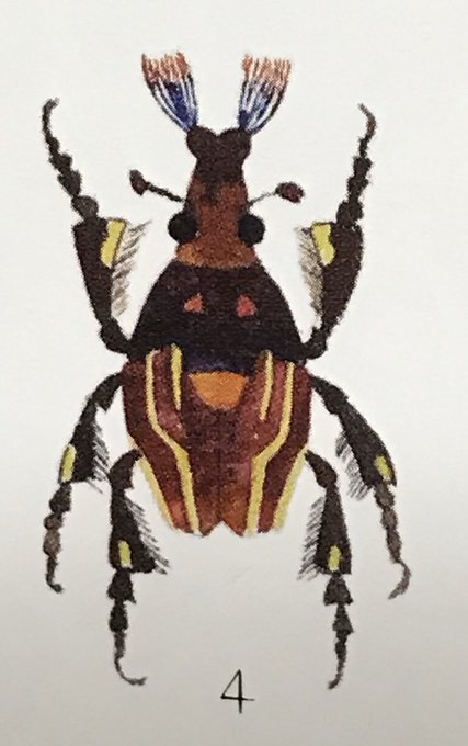 【空想】星の虫図鑑 センネンタマムシ科:幼虫は、非常に堅い枯木や何千年もの樹齢の木の中で10年から100年ものときを過ごす。成虫は10〜1000年に一度、羽化する 【ノコギリセンネン】 黒檀よりも固い極檀の木につく #くぼやまさとる #星の虫 #空想の虫 #水彩
