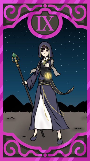 タロットカード9隠者:夜永酔さん 9隠者の正位置/経験則、高尚な助言、秘匿、精神、慎重、優等感、思慮深い、思いやり #隠者のタロットカード #酔彩画_夜