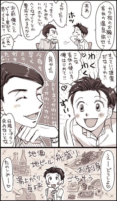 リーマンカラおそ👔💼 仕事がデキる男の作り方④ 純粋に楽しみオーラのおそ松😆とシタゴコロ丸出しのカラ松😎 タイトル回収にあと2ページ続く。