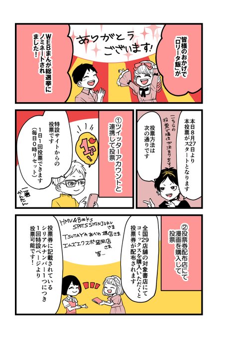 皆様のおかげで「ロリータ飯」がWEBまんが総選挙にノミネートされました!本日より投票が始まりますので、投票方法を漫画にしました。投票はこちらから!→【https://t.co/Hu004Q70cP】