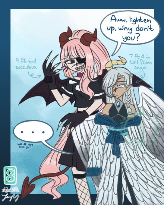 So if you guys remember my recent comment-designed villain OC (the succubus) and my challenge-created OC (the fallen angel), I thought they'd make for fun rivals!! 👀💙💙💙