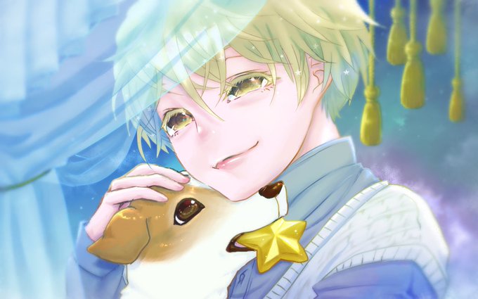 犬!道行く人のあきらめかけた夢のかけらを星にして夜空に光らせる能力のある犬と、そんなことには全く気付かず可愛がる飼い主という妄想をしながら描きました。つやつや。