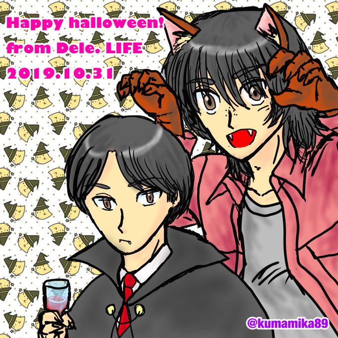 本日の〆デジ ハロウィン絵。「Dele」坂上"吸血鬼"圭司さんと、真柴"狼男"祐太郎君。何とか当日にわりとギリで間に合いました~;;;
