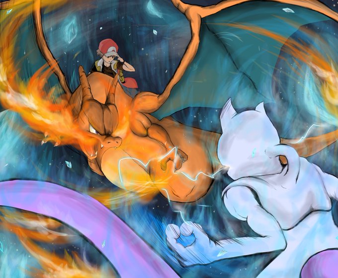 ハナダの洞窟にて 久しぶりにミュウツーとリザードンとレッド描きました! #イラスト #ポケモン #リザードン #ミュウツー #レッド