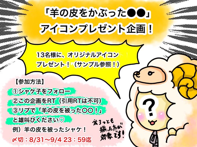 ★✴︎イラスト企画‼︎✴︎★ / 「羊の皮を被った貴方」 アイコンプレゼント🐏❤︎🐏 \ 【参加方法】 ①シャケ子(@kumanoshakeko )をフォローください〜! ②このツイートをRT ③リプで「羊の皮を被った●●!」と雄叫びください!! ※3つ揃った方が対象になります。 〆切〜9/4(水)23:59まで