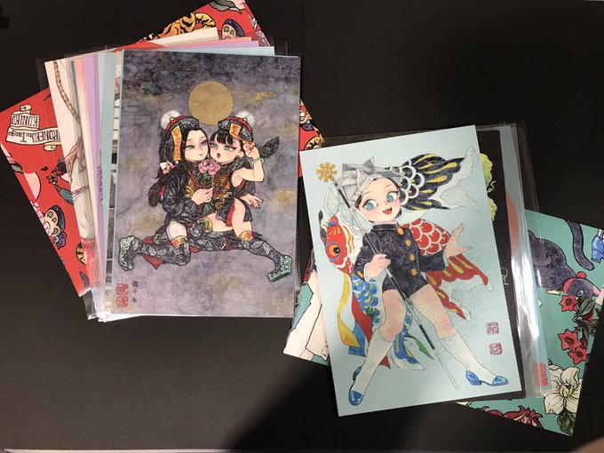 新作はA4サイズ千代紙のセットとポストカードと原画。ポストカードのお得なセットを少し用意致します👻💨