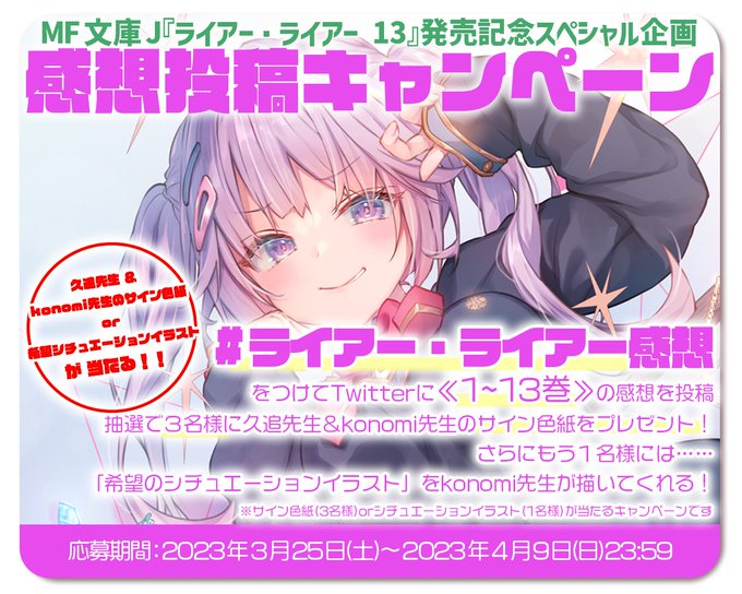 【夜宣伝!】嘘×ゲーム×学園×ラブコメの『#ライアー・ライアー』シリーズ!最新13巻が本日発売となりました!✨✨ 毎巻恒例の感想キャンペーンも実施中ですので、週末や春休みのお供にぜひぜひぜひ! #ライアラ