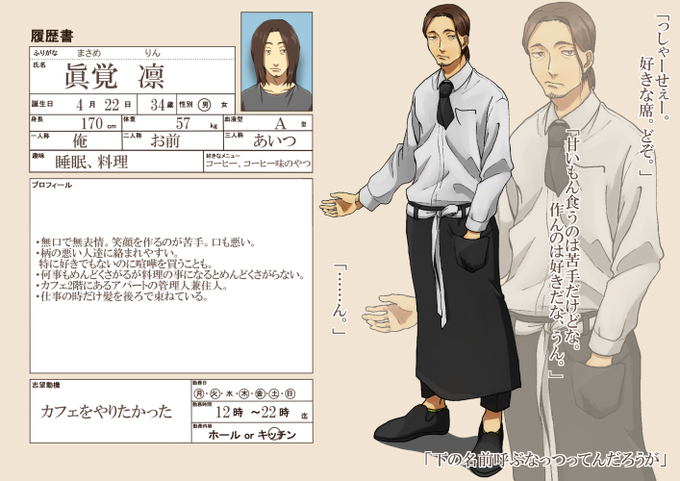 こちらの企画【@Flat_cafe 】に店長枠として失礼します。下の名前が女性っぽいからあんまり呼ばれたくない凛さん。キッチン担当です。副店長とは幼馴染になります。補足はまたあとで。 よろしくお願いします。