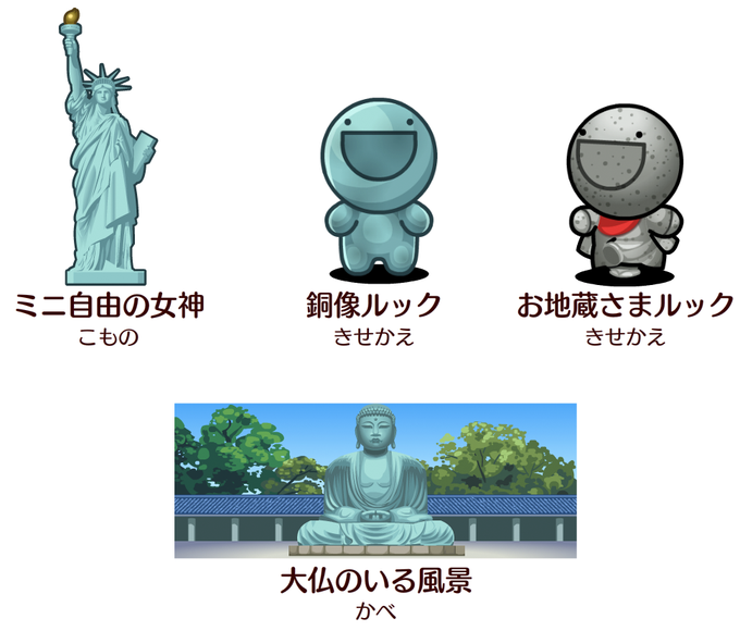 さらに、イベントを進めていけば銅像や石像をモチーフにした きせかえアイテムも製造できるようになるよ。フフフ… #ふしぎな生き物ふにゃもらけ