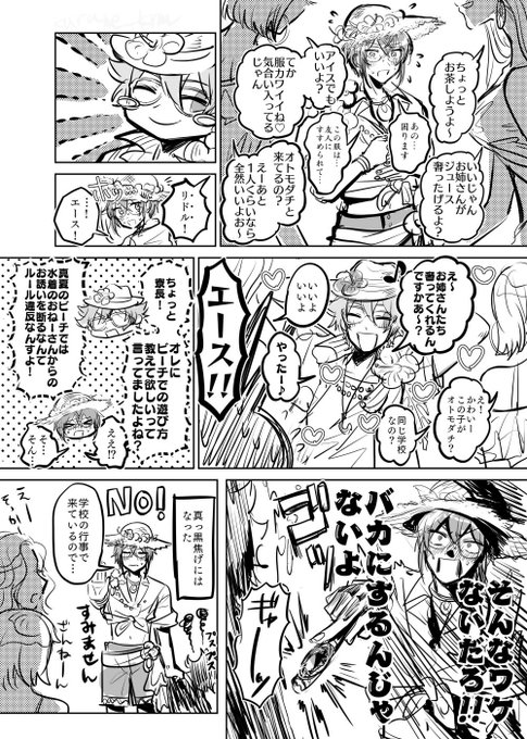 水着のおねーさんに絡まれるリドノレとおこぼれに預かろうとしているヱ〜スの漫画