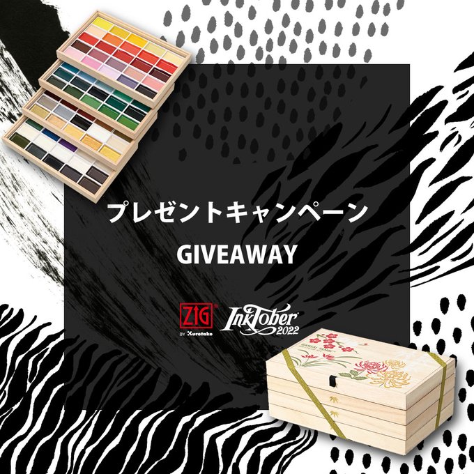 呉竹の商品を使って描いた作品を、#kuretakeinktober2022_giveaway のタグをつけてSNSに投稿して #インクトーバー に参加して頂くと、抽選で1名様に新発売の「呉竹 顔彩耽美 桐箱100色セット」をプレゼントいたします!