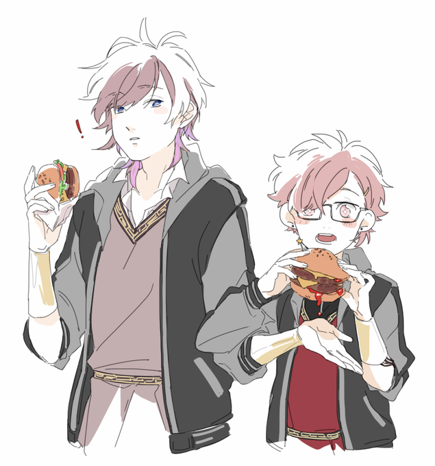 hephy (right) and orpheus (left, belongs to @le_skits) on some casual dates! 😚💕 hephy likes his burgers double-stacked sans lettuce sans pickles sans tomatoes... (a healthy boy)