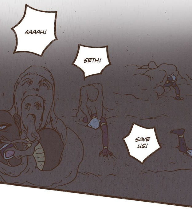 Shortly after Horus' arrival Seth asks him about his past, he grew up hiding from the caravans among other humans during Seth's reign, so Seth wanted to know what kind of fate they wished for him but Horus said it is not his place to speak for them, his experience was different.