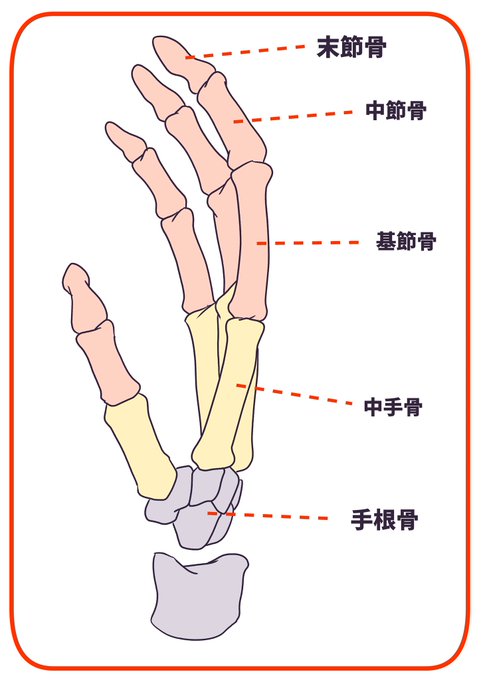 手首の付け根の手根骨(しゅこんこつ)から扇状に指の骨が広がってるよ〜。