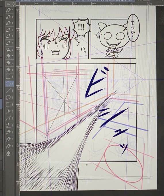 51ページ。 色んなものがパースに乗っていなくて、頭が痛くなるコマ…😇 三点透視で再構築。 楕円ツールもパースに沿ってくれるのね⭕️ この本棚、天面見えるんか見えないんか? アイラインより上だから見えないのが正解か👀