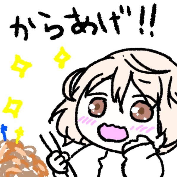 みなみんのBDUR 周りにお料理があるなか、唐揚げ(?)の登場に「ふわぁあ!」ってなってるストーリーが想像できてかわいいなあ。よく見ると、よだれ出てるし🤤 唐揚げにピックが刺されてるのに握り箸してて。お箸でえーいって刺していっぱい食べるんだろうねえ💥🥢