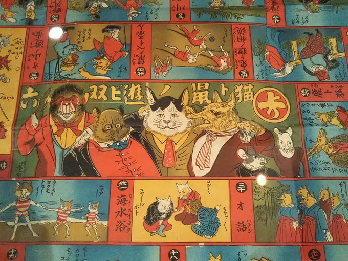 「ぶんきょういきもの大集合!」。「猫ト鼠ノ遊ビ双六」。明治後期の世相を反映したマスのイラストが楽しい。21マス目「貉ト狸」、意味わかんなくて好き。ドーダエライダロー