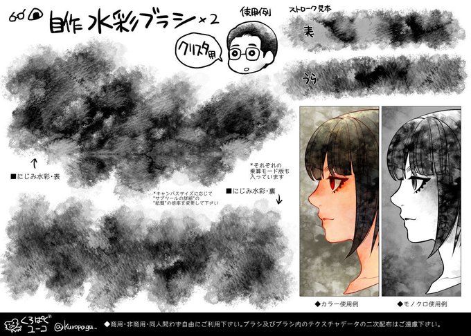 クリスタ用の自作にじみ水彩ブラシです。画像の様なにじみの強い水彩風のタッチの筆です。宜しければ使ってやって下さい!(●^o^●)(※商用非商用問わずフリーですが二次配布はご遠慮下さい) https://t.co/gw9M9r8Wfe