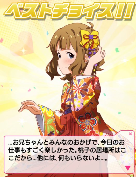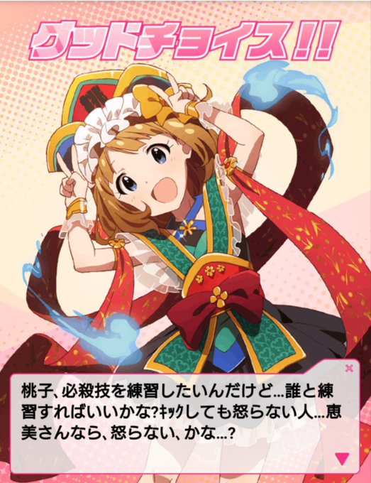 アイドルファイトなら桃子が恵美をドロップキックして、そのままふみふみしてたのが大好きです(公式) ミリシタの形式だと多分出てこないけどね… 最後の桃子の台詞がまた泣けるんだよな…