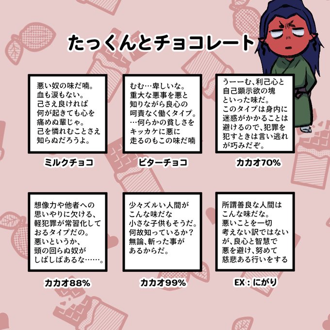 @KATANAGAMI_kabe 寝付く気持ちがわかなかったので、チョコレートのカカオ%と悪人の血の味の比較をしてもらっていた。