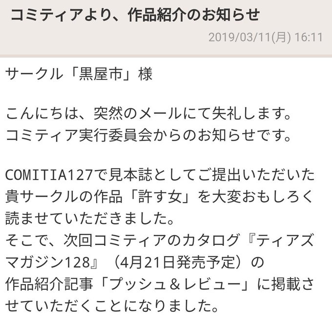 改めて宣伝、コミティアより作品紹介のメールが来ました。