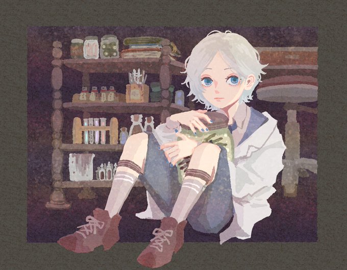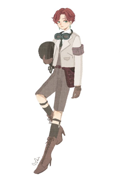 #キャラ被りデザインゲーム ライダースゴーグル/赤毛/編み上げブーツ/小生意気/大きめの耳飾り/ホクロ/ソックスガーター とある自警団に密かに所属する少年(実はいいとこの坊ちゃん)という設定。。。